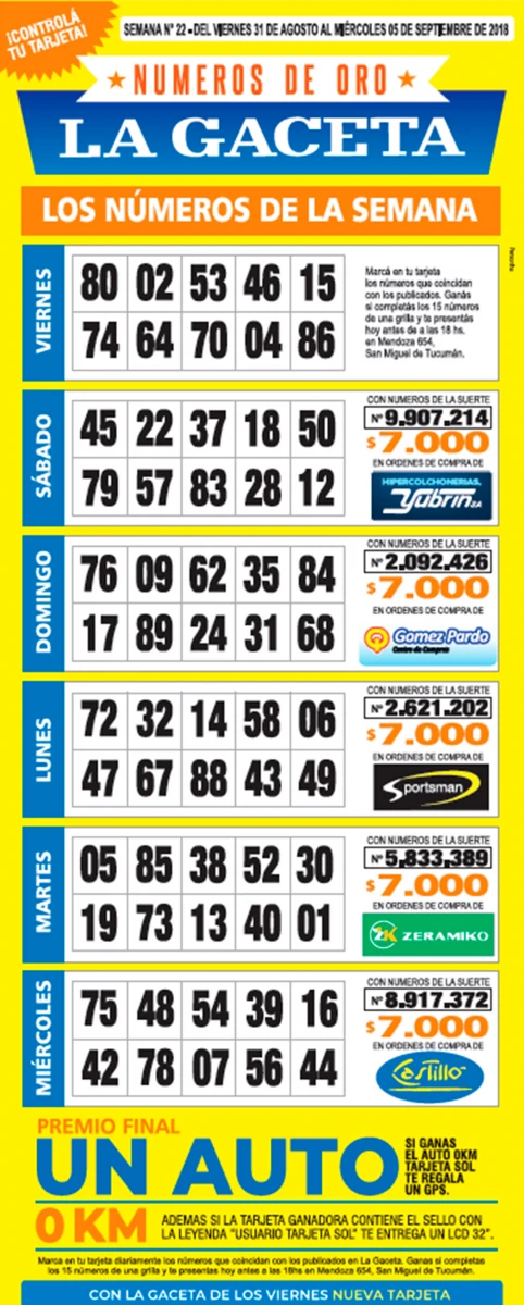 Como cada miércoles se publicó la grilla completa de los Números de Oro de LA GACETA para que los lectores puedan revisar sus tarjetas. Aquellos que completen los 15 números de una de las grillas de su cartón deberán presentarse en calle Mendoza 654 hasta las 18. En caso de que el ganador sea usuario Tarjeta Sol, duplica el premio. El pozo es de $ 400.000.