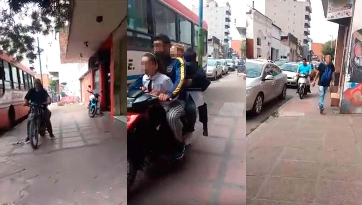 En la filmación, además, se observa que todos los que circulan arriba de las motos lo hacen sin cascos; incluso, en uno de los vehículos, se puede ver que van cuatro personas a bordo, una de ellas un niño que es sujetado por su madre y que queda con medio cuerpo afuera.