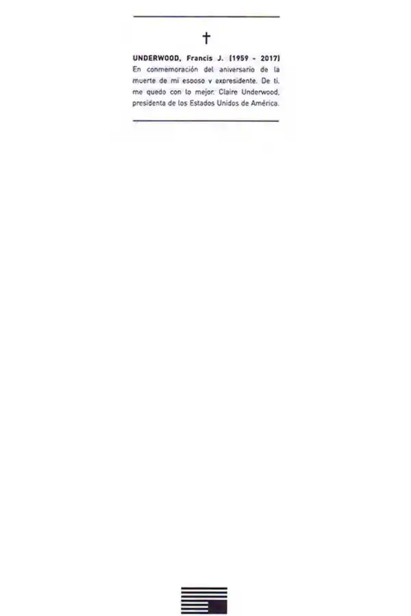 Una página en blanco, sin títulos ni firmas. Apenas este obituario: “UNDERWOOD, Francis J. (1959-2017). En conmemoración de la muerte de mi esposo y expresidente. De ti, me quedo con lo mejor. Claire Underwood, presidenta de los Estados Unidos de América”. Al pie, una bandera con las barras y las estrellas invertidas, símbolo de una de las series fundacionales y pilares del fenómeno Netflix. El aviso sorprendió el domingo a los lectores de los principales diarios del mundo -Argentina incluida- y provocó un doble efecto: el regocijo de los fans de “House of cards” y la curiosidad de los no iniciados. Una doble victoria para el departamento de marketing del gigante del streaming, que el 2 de noviembre estrenará la tan esperada -y última- temporada de la serie.