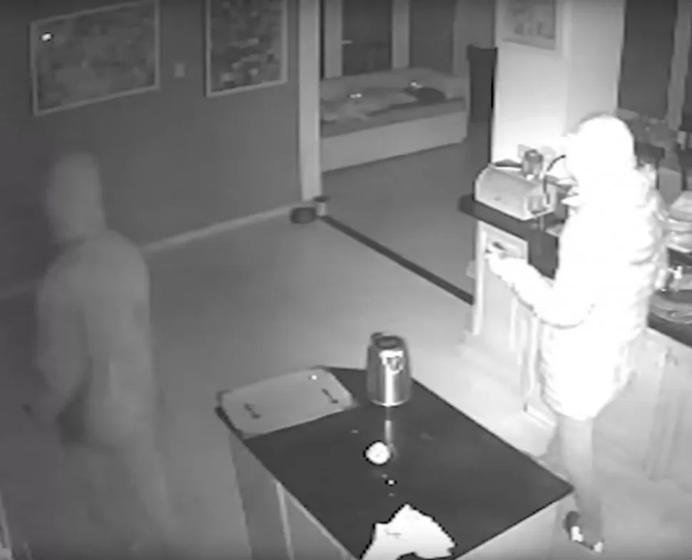 REGISTRADOS POR LAS CÁMARAS. Los ladrones, que actuaron encapuchados, revisan la cocina de uno de los domicilios donde ingresaron. CAPTURA DE VIDEO