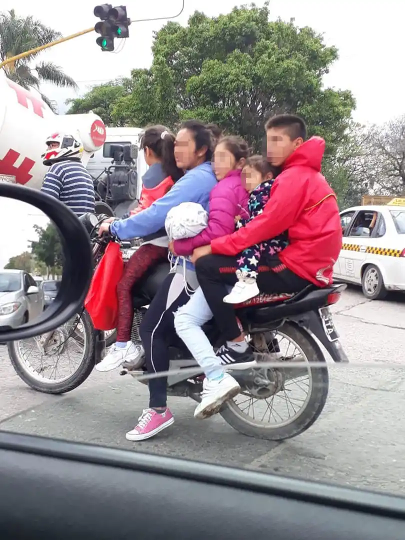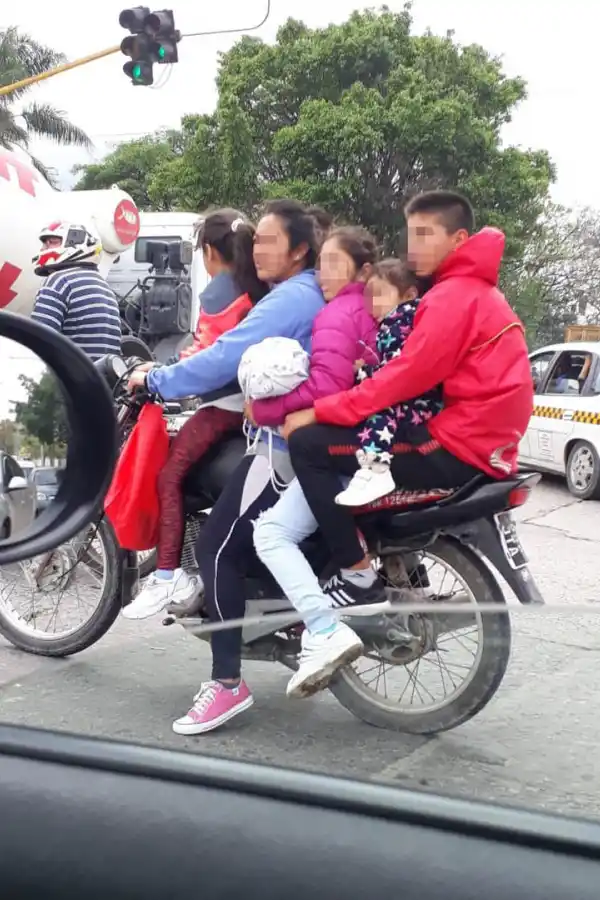 Zona de El Manantial, en un cruce semaforizado: cinco personas en una moto, un adulto y cuatro menores de edad, entre camionetas, motos similares, taxis y camiones de todo tamaño. Un lector envió la foto expresando su preocupación porque la conductora, que sería la madre de los tres niños y el adolescente, guía el vehículo mientras sus hijos se sostienen, unos entre otros, para no caerse y sufrir un accidente o algo peor. La imprudencia se completa para mal, porque ninguno de los cinco ocupantes lleva puesto un casco protector y obligatorio para todos los que circulan en moto. El lector critica que en esos puntos de la ciudad los inspectores de tránsito brillan por su ausencia, por lo que reclama que se intensifiquen los controles para evitar que ocurran desgracias.