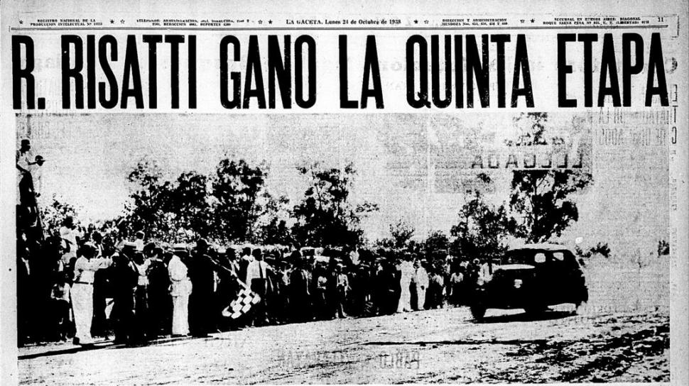 El Gran Premio Argentino de 1938 pasó por rutas tucumanas entre el 22 y 23 de octubre. La quinta etapa, que se había iniciado en La Quiaca, concluyó en nuestra ciudad. El triunfo correspondió a la máquina número 85, al mando de Ricardo Risatti, que llegó a la meta ubicada en el “boulevard de Los Ejidos” (hoy Francisco de Aguirre) minutos antes de las 16. El tramo cubría 796 kilómetros, que fueron recorridos en casi 10 horas.