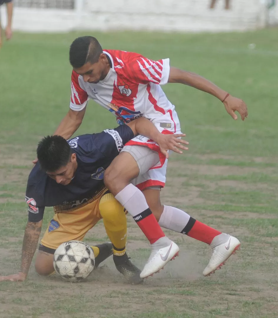 BUEN TRABAJO. Roque Villagra, de Ñuñorco, lucha por la pelota con Dante Páez. la gaceta / foto de Antonio Ferroni
