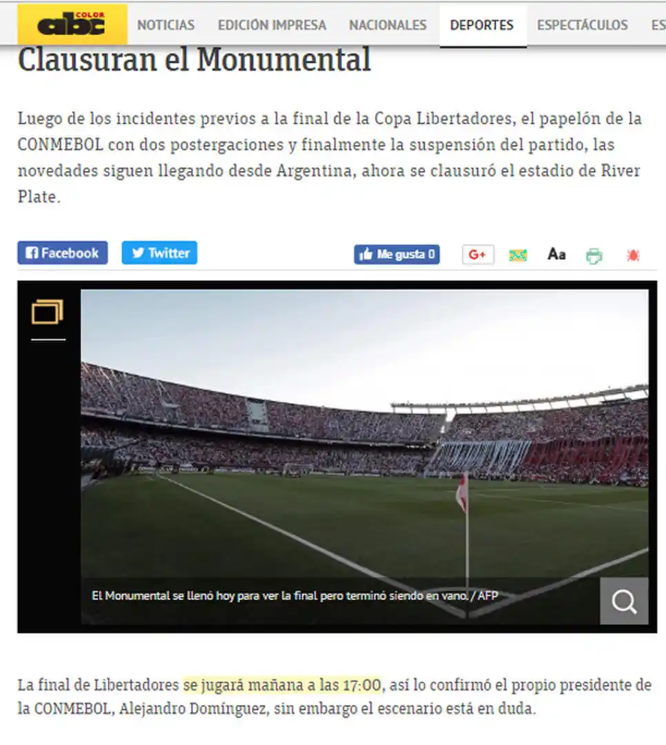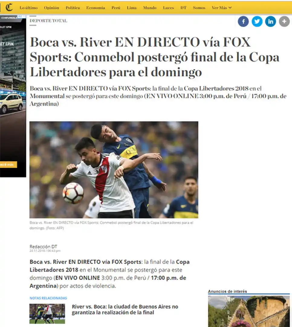 “La Conmebol postergó la final a pedido de ambos clubes, al no estar dadas las condiciones a causa de los graves incidentes que se produjeron en las afueras del Monumental cuando el autobús que trasladaba al plantel boquense fue atacado por fanáticos del equipo local”, informó El Comercio, de Perú.
