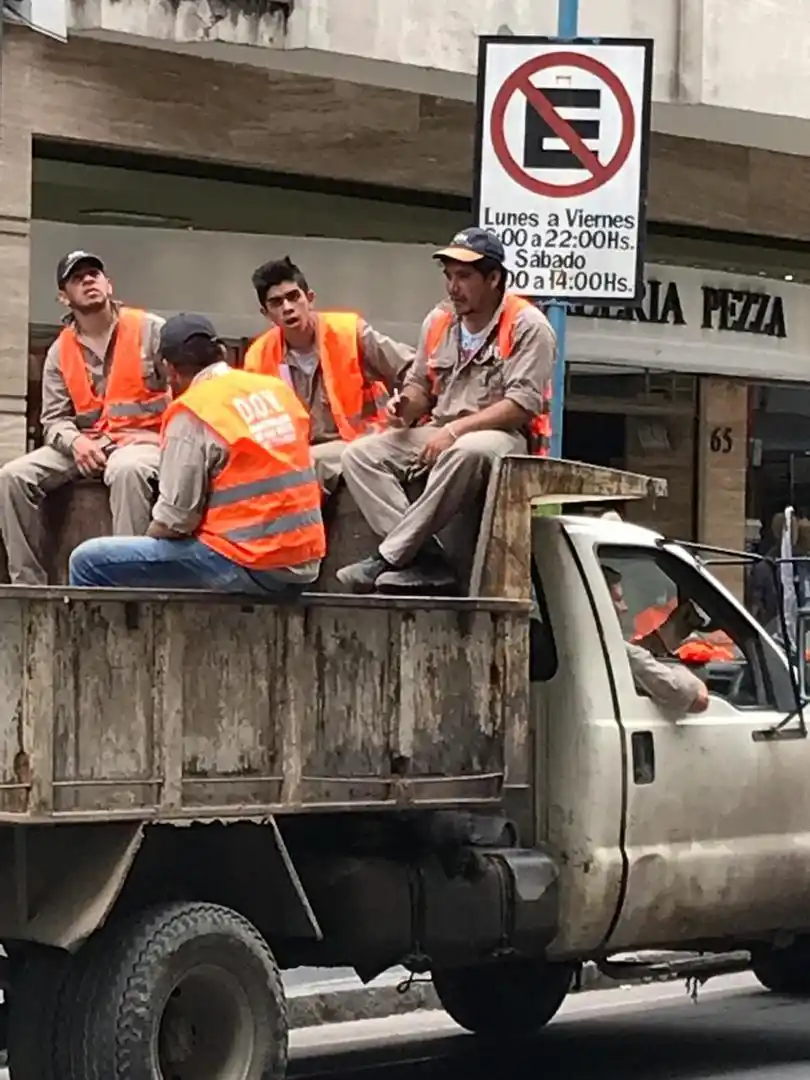 Un vecino envió la foto quejándose por las condiciones de inseguridad y violación de las normas de tránsito, en que cuatro obreros eran traslados en un camión porf calle San Martín al 600, casi esquina Muñecas. El lector detalla que los operarios van sentados en los bordes de la caja del camión (primera irregularidad), sin arneses de seguridad (segunda irregularidad), en un camión sin chapa patente (tercera norma incumplida). El lector se queja porque a los automovilistas les exigen el cumplimiento de numerosas normativas, pero todas serían violadas por el camión del organismo oficial sin identificar.