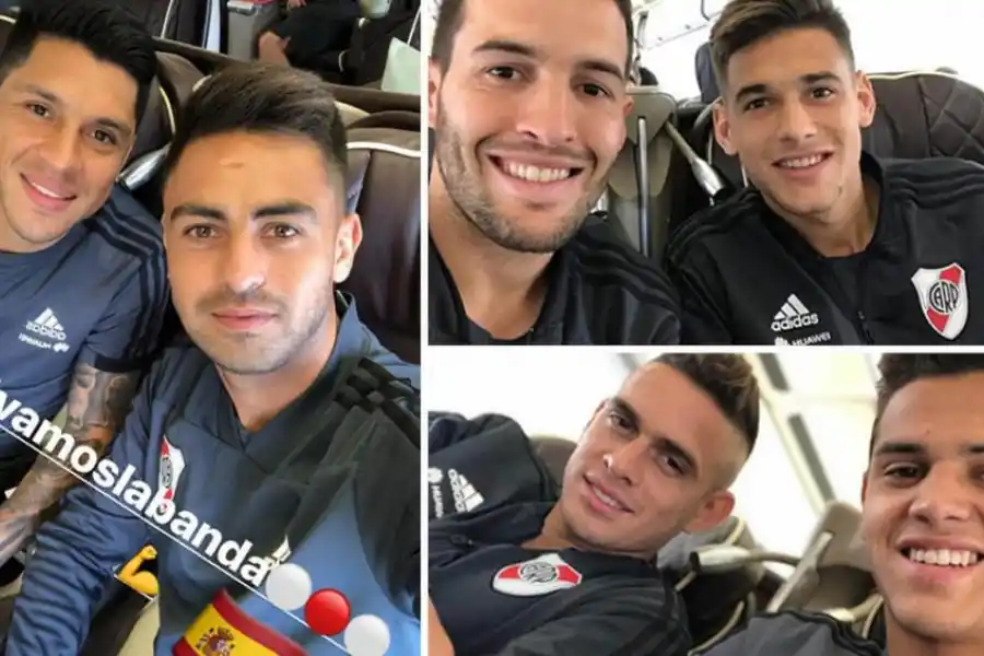 CONFIADOS Y FELICES. Los integrantes del plantel “millonario” partieron ayer rumbo a la sede de la superfinal y se sacaron fotos en el interior del avión. twitter riverplatepho