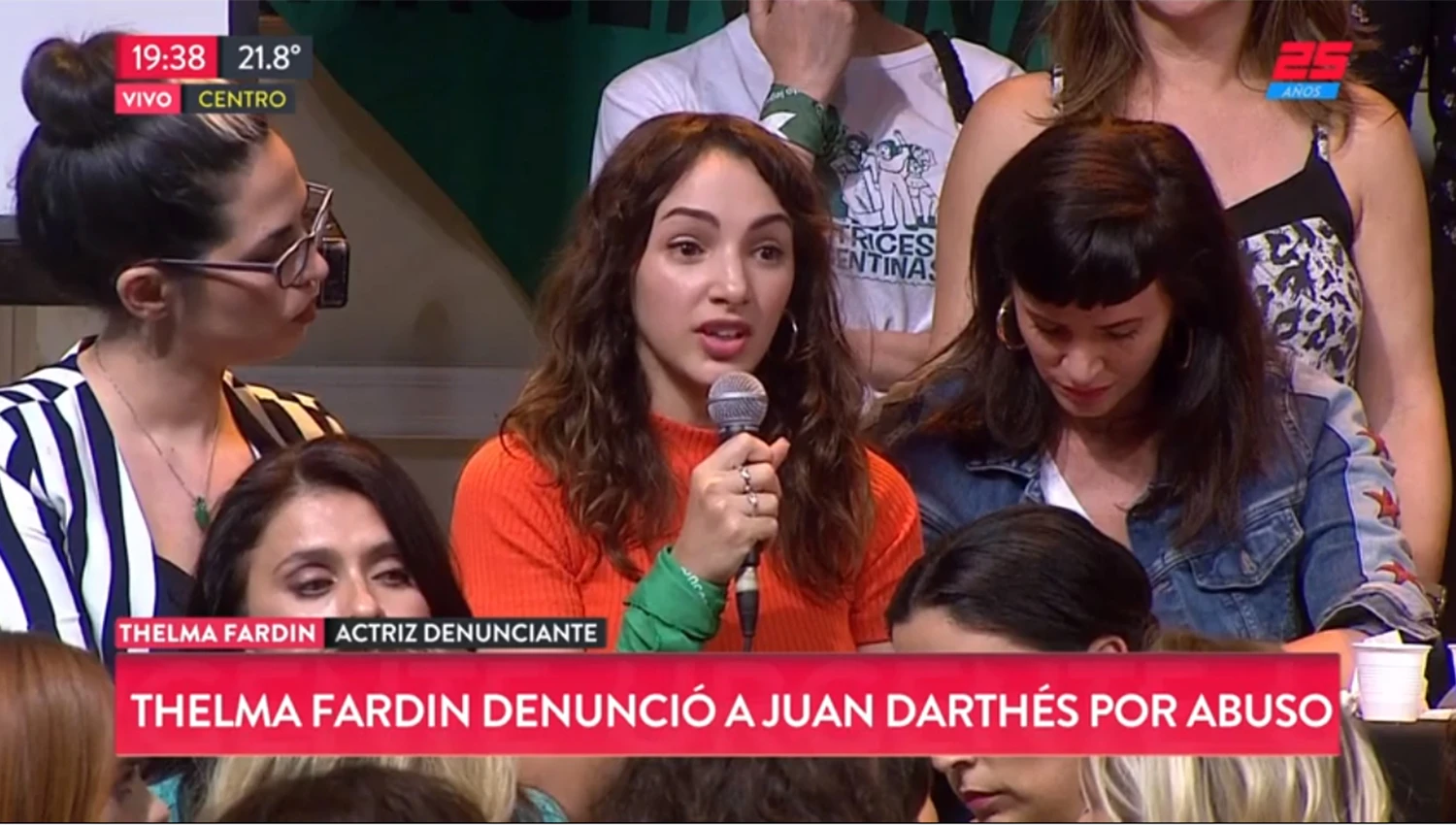 La actriz Thelma Fardín, ahora de 26 años, denunció penalmente que Darthés había abusado de ella cuando tenía 16 años y ambos trabajaban en la tira "Patito Feo". Lo hizo a través de una entrevista grabada con la periodista especializada en género, Luciana Peker, que se emitió en la conferencia de prensa en pantalla gigante.