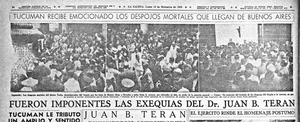 “Su ciudad natal, en su más amplia y auténtica representación, ha rendido a Juan B. Terán, en el acto de la inhumación de sus restos, el homenaje que se merecía. Se lo había ganado con su lucha permanente por el bien público, cultivando la inteligencia y tratando de llevar a su pueblo y a su patria por los mejores caminos hacia el porvenir. Por eso se preocupó, en primer término de la educación de la infancia y de la juventud y animó con su soplo la luz de la inteligencia, siendo el primero en encender la propia antorcha de su mente, para ser el guía de las jóvenes generaciones”. Con estas palabras nuestro periodista iniciaba la crónica sobre las ceremonias que se realizaron el 11 de diciembre de 1938 cuando los restos del fundador de la Universidad Nacional de Tucumán llegaron de Buenos Aires. Había muerto allí el 8 de aquel mismo mes, para recibir sepultura en el Cementerio del Oeste. “Fueron imponentes las exequias del Dr. Juan B. Terán”, tituló nuestro diario y la bajada decía: “Tucumán le tributó un amplio y sentido homenaje”. El reconocimiento social se demostró en la multitud que participó de los actos y acompañó el cortejo hasta el cementerio.