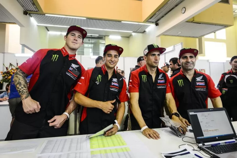 EQUIPO PODEROSO. El Honda Racing Corporation en la verificación administrativa, con Ricky Brabec, Ignacio Cornejo, Kevin Benevides y Paulo Gonçalves. twitter @dakar / @cyrildespres