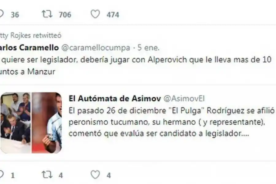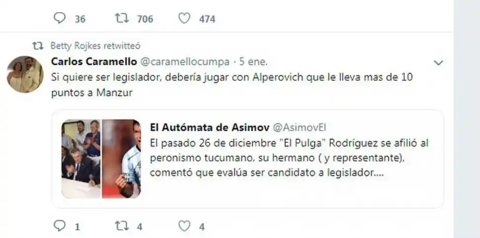 Rojkés y sus retuits.- La ex senadora nacional Beatriz Rojkés de Alperovich, que está en uso de licencia como presidenta del Partido Justicialista de Tucumán, mantiene un perfil bajo desde hace meses, incluso a través de las redes sociales. En su cuenta de Twitter, la ex presidenta provisional del Senado publica pocos comentarios propios, pero suele compartir, a través de retuits (réplicas de tuits), los dichos de otros usuarios. En una de sus últimas intervenciones por esta vía, citando el texto de un tercero sobre la afiliación de Luis “Pulguita” Rodríguez al PJ, Rojkés de Alperovich aludió a la interna entre su esposo, el senador José Alperovich, y el sucesor de este, el gobernador Juan Manzur. “Si (el futbolista) quiere ser legislador, debería jugar con Alperovich que le lleva mas de 10 puntos a Manzur”, expresó @caramellocumpa, al que Rojkés dio retuit (foto).