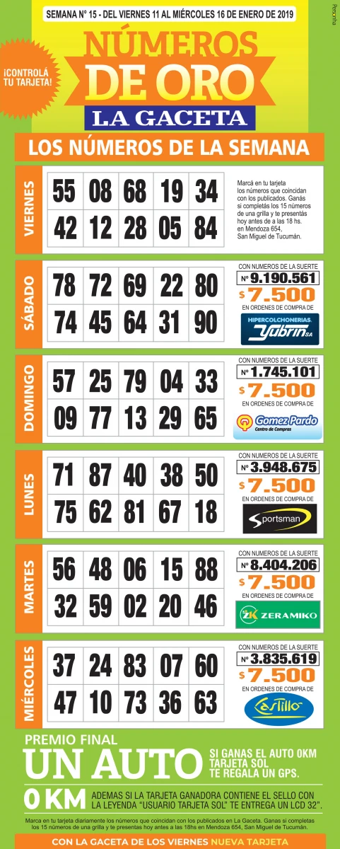 Números de Oro La grilla completa de los Números de Oro de LA GACETA Controlá tu tarjeta. Podés ser uno de los ganadores del premio de esta semana. Compartir Whatsapp Facebook X Copiar dirección URL 16 Enero 2019 Seguir en Esta nota es de acceso libre. Tamaño texto Comentarios Lo más popular Interna en LLA Tucumán: un integrante de la mesa chica rompió con Catalán y lanzó su propio espacio Por primera vez y con un show nuevo, Pimpinela se presentará en el Palacio de los Deportes Presentaron un proyecto para que el Boleto Estudiantil Gratuito sea ley en Tucumán Alarma por la informalidad juvenil: siete de cada 10 jóvenes no tiene trabajo registrado La UNT convoca a estudiantes a postularse a un programa en Alemania: lo que tenés que saber El nombre que empezó a ganar terreno en San Martín tras el empate en Puerto Madryn