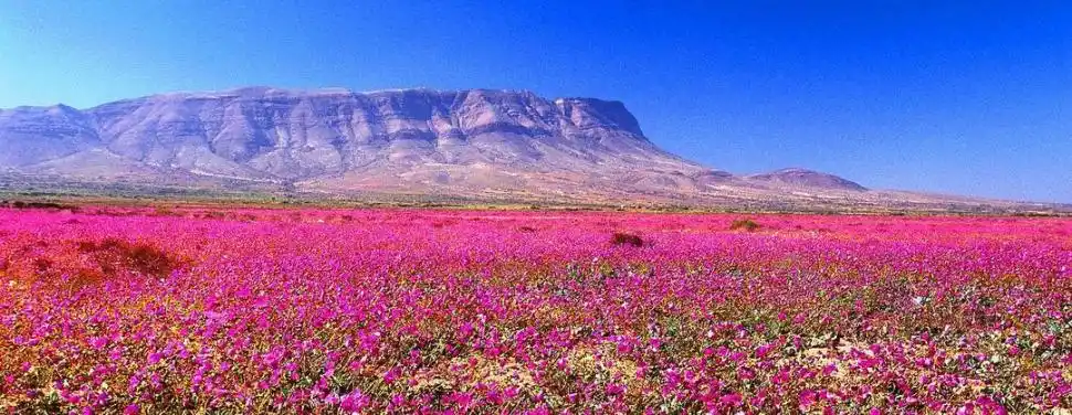 Es entonces cuando la naturaleza se despierta y recubre el desierto con un manto rosa y violeta. Suspiros celestes, malvas, lirios amarillos, orejas de zorro de color rojo y celestinas... más de 200 especies endógenas brindan a los turistas una bienvenida única.