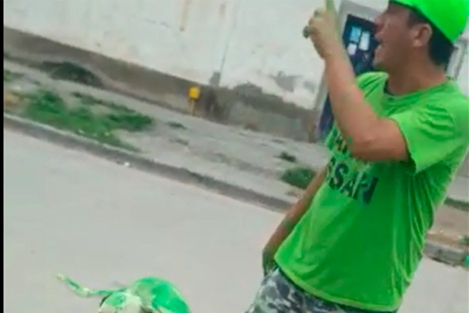 La secuencia no deja lugar a dudas: uno de los trabajadores toma su brocha con la tradicional pintura de color verde y pinta al perro, haciendo caso omiso a los reproches de algunos de los miembros de su cuadrilla. Incluso, vuelve a llamarlo mientras otro mantiene la filmación con el telefóno celular para volver a pintar al animal.