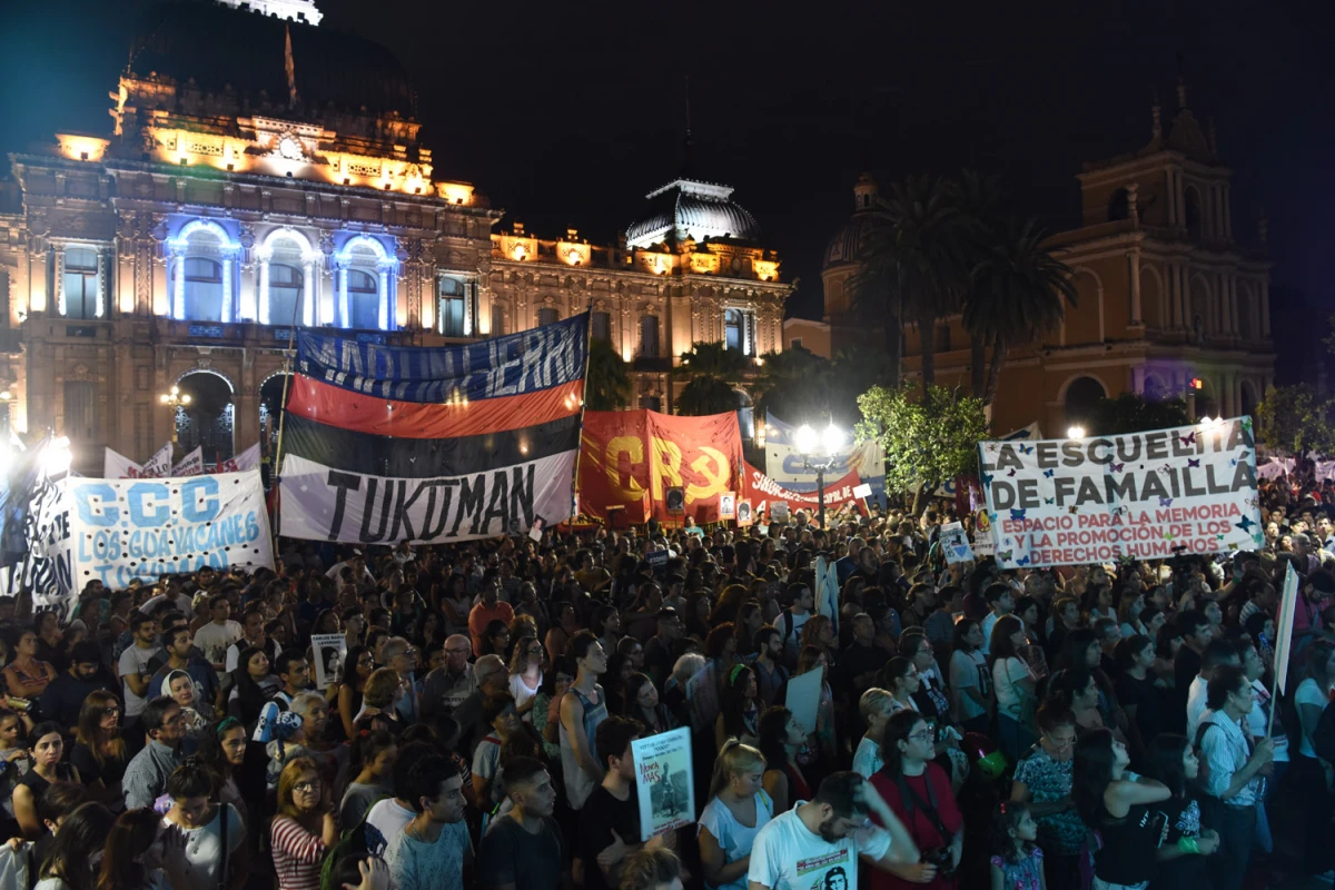 En el centro tucumano hubo al menos tres convocatorias distintas para conmemorar el 24 de marzo bajo distintos tonos políticos. La concentración más populosa partió desde la esquina de Santa Fe y Junín, donde la ex Jefatura de Policía funcionó un Centro Clandestino de Detención (CCD) durante la década del 70. Organizaciones de derechos humanos como Hijos, Familiares de Desaparecidos de Tucumán (Fadetuc), Asamblea Permanente por los Derechos Humanos (APDH) y la Fundación Memorias e Identidades del Tucumán, entre otras, se movilizaron hasta la plaza Urquiza, donde se sumaron organizaciones sociales gremiales y políticas.