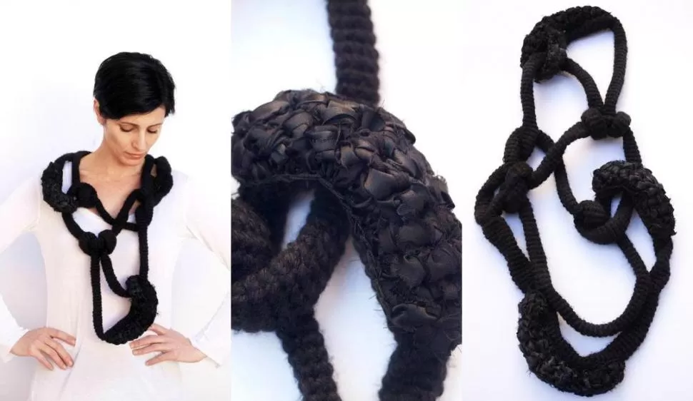 “Lo textil carga con memoria y rastro de quien o quienes lo usan, es por eso que la mayoría de mis obras están hechas con donaciones: corpiños, bombachas, pelos y prendas; me interesa el rastro del otro para construir. Por otro lado, no solo el material es textil sino que también las técnicas como la costura, el bordado y los tejidos”, cuenta Jessica Morillo, especializada en joyería contemporánea.