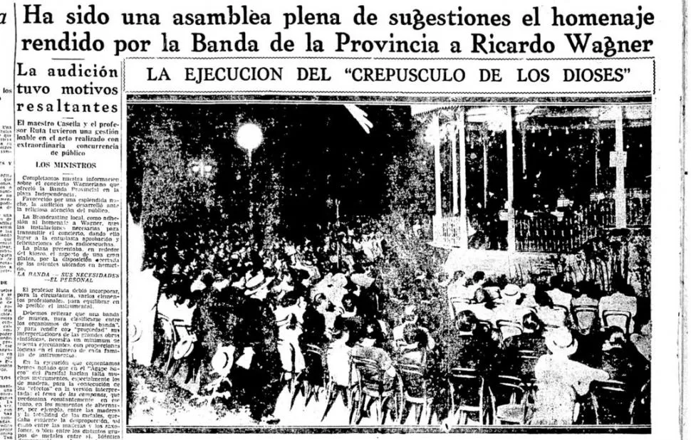 Una recordada presentación de la banda se produjo en noviembre de 1933 cuando, al mando del maestro José Ruta y del profesor Casella, presentaron un concierto en honor a Richard Wagner. Además, la actuación fue transmitida por radio, lo cual constituyó una novedad para la época, ya que la mayoría de las emisiones se hacía desde estudios. De acuerdo con el relato de nuestro diario, la transmisión fue recibida en toda la ciudad con la “entusiasta aprobación y felicitaciones de los radioescuchas”. La noche fue espléndida, con una temperatura agradable y la plaza se vio colmada de público entusiasmado por escuchar a los músicos. Los organizadores ubicaron los asientos en hemiciclo para que todos puedan ver la presentación con comodidad.