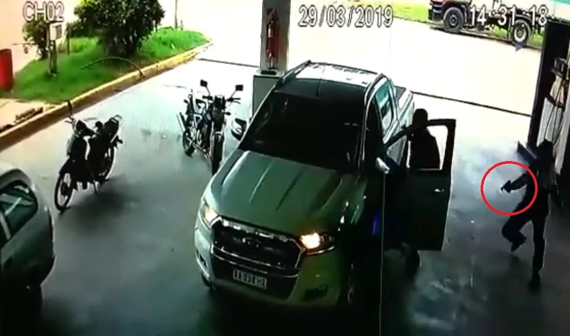 Un grupo de delincuentes baleó a un hombre en las piernas durante un robo ocurrido en una estación de servicio ubicada cerca del Mercofrut, en la Autopista Sur, kilómetro 804. El hecho ocurrió ayer a la siesta, cerca de las 14.30, y el momento quedó filmado por las cámaras de seguridad del lugar.
