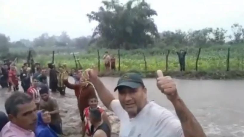 "Así está el camino a Colonia 12, Santa Ana. Los docentes estamos pasando gracias a la ayuda de los padres. Nunca más esto, ¿no?", se escucha relatar a una voz en un video que muestra cómo armaron una especie de "cordón humano" para que el agua no arrastre a nadie.
