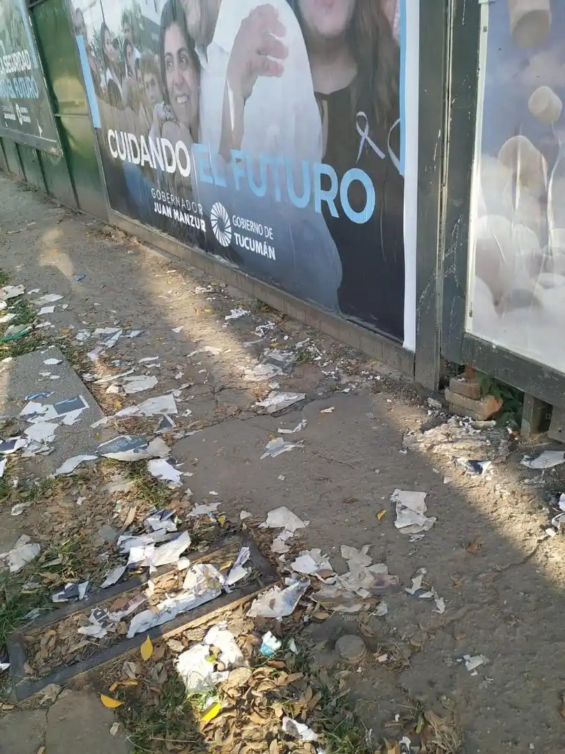 En avenida Aconquija al 1.100, quedó mucha basura en el piso después que por el lugar pasó una cuadrilla colocando afiches políticos. La lectora define como una vergüenza lo que observan todos los días, se queja por la suciedad que dejan al cambiar la propaganda.
