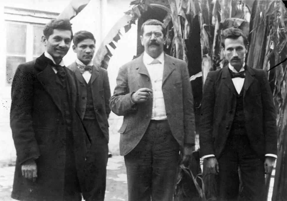EUSTAQUIO MORALES. Es el primero de la derecha. A su lado posa Rodolfo Peppert y luego otros empleados de la Oficina Química Municipal.