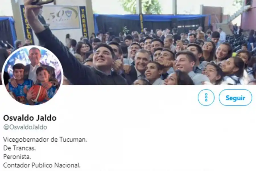 El gobernador (@JuanManzurOK) tiene 17.700 seguidores. Se unió en mayo de 2015 a Twitter y se presenta como “Gobernador de Tucumán. Presidente del PJ Tucumán y Congresal Nacional del PJ. Presidente de la Zicosur. Médico y ex ministro de Salud de la Nación (2009-2015)”. El titular de la Legislatura (@OsvaldoJaldo), que se unió en diciembre de 2015, tiene 8.747 seguidores y se presenta como “Vicegobernador de Tucumán. De Trancas. Peronista. Contador Público Nacional. Trabajamos juntos en toda la provincia para construir un Tucumán mejor”.