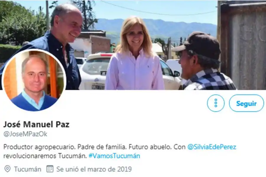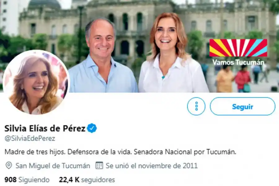 Elías de Pérez (@SilviaEdePerez) es la que, individualmente, tiene más seguidores: 22.400; se unió en noviembre de 2011 -una de las más antiguas en esta red- y se describe como “Madre de tres hijos. Defensora de la vida. Senadora Nacional por Tucumán”. Su compañero de binomio, Paz (@JoseMPazOk) se unió en marzo pasado -cuando fue presentado como candidato a vice de la coalición opositora)- y sólo le suma 321 seguidores a la fórmula. Se presenta como “Productor agropecuario. Padre de familia. Futuro abuelo. Con @SilviaEdePerez revolucionaremos Tucumán”.