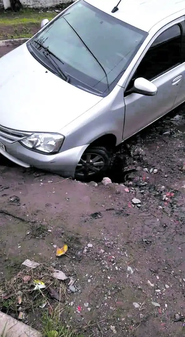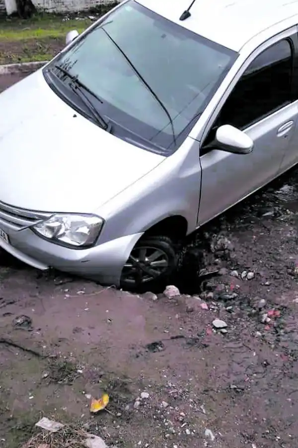 Un lector envió la foto superior, que muestra a un auto atrapado en una agujero en el pavimento, en Saavedra y Chile. Cuenta que el lunes a la tarde la rueda delantera izquierda del vehículo se hundió porque faltaba la tapa del desagüe cloacal de la SAT.