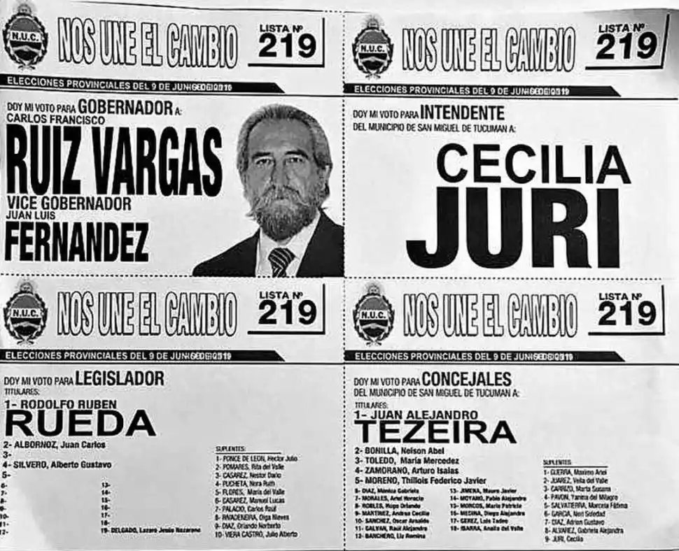 El candidato a gobernador por el espacio Nos Une el Cambio, Carlos Ruiz Vargas, publicó una fotografía del modelo de la boleta que tendrá en el cuarto oscuro el domingo 9 de junio. Sin embargo, en la nómina de aspirantes titulares a la Legislatura hay un considerable espacio en blanco (foto inferior). El ex juez penal jubilado en 2010 contó que le “bajaron” 15 de los 19 candidatos por falta de fotocopia del documento de identidad. “Nos sacaron a algunos, los demás seguimos; lo mismo les daremos pelea”, expresó el postulante para suceder a Juan Manzur.