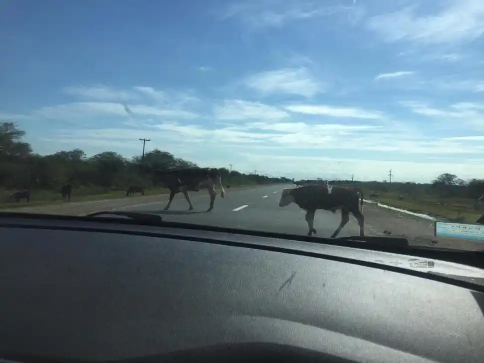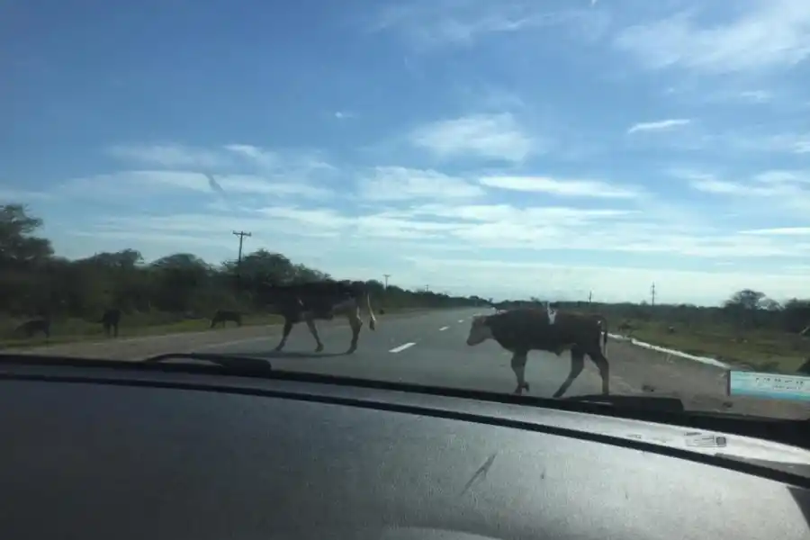 La foto superior fue tomada por el conductor de un vehículo el martes último, a las 12.45. Muestra a varios animales cruzando libremente la ruta provincial 157, a unos 2 km al norte de la localidad de Monteagudo, al sur de Tucumán.