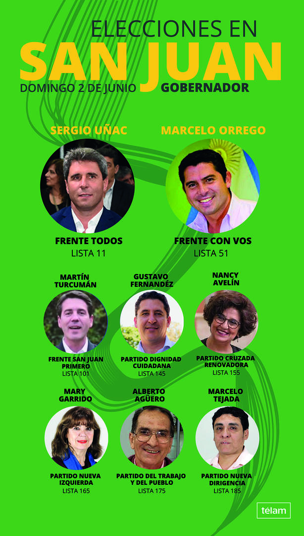 El gobernador peronista Sergio Uñac buscará hoy ser reelecto en las elecciones en San Juan, después que se impusiera en las PASO de marzo con casi el 55% de los votos y con una diferencia de más de 20 puntos sobre el segundo. Marcelo Orrego, de Con Vos, quedó detrás de Uñac en las PASO con un 32% que podría mantener hoy, pese a que en la contienda no participa con los colores ni con la simbología de Cambiemos.