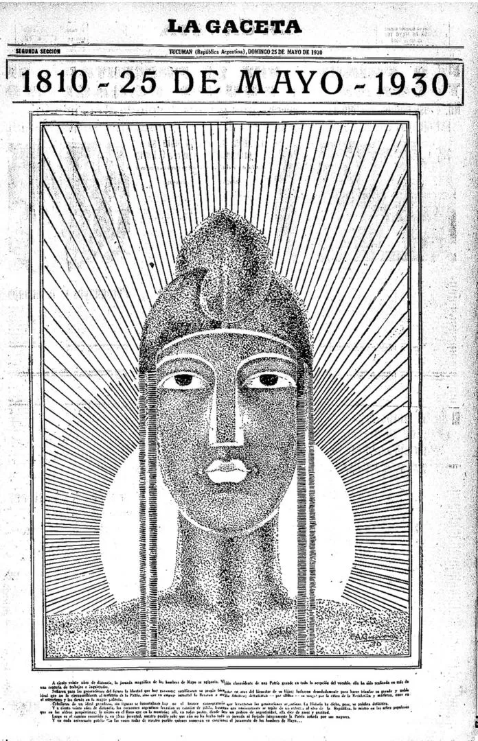 En 1920, con aires griegos, un trabajo de Rodríguez Marquina embellece la tapa donde también se anunciaba la ampliación de nuestros talleres gráficos. En 1935, Ricardo Saravia ilustra el suplemento con la cabeza de la República que nos mira medio de reojo; debajo, en grandes letras y números, aparece “25 Mayo”. Sin embargo, llama mucho la atención la imagen de 1930 realizada por Cisneros: de frente al lector, la República mira hacia arriba y presenta rasgos muy similares al robot de la película alemana Metrópolis, que se había estrenado en nuestra provincia un año antes. Debajo se podía leer: “A ciento veinte años de distancia, la jornada magnífica de los hombres de Mayo se agiganta”. Y agregaba: “soñaron para las generaciones del futuro la libertad que hoy gozamos, sacrificaron su propio bienestar en aras del bienestar de sus hijos, lucharon denodadamente para hacer triunfar su grande y noble ideal”.