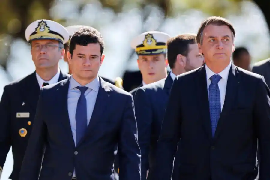 En medio de la tormenta, el presidente Jair Bolsonaro respaldó a Moro. Atravesaron juntos, en lancha, el lago Paranoá de Brasilia, para una ceremonia en la que el ministro fue condecorado. (Télam)