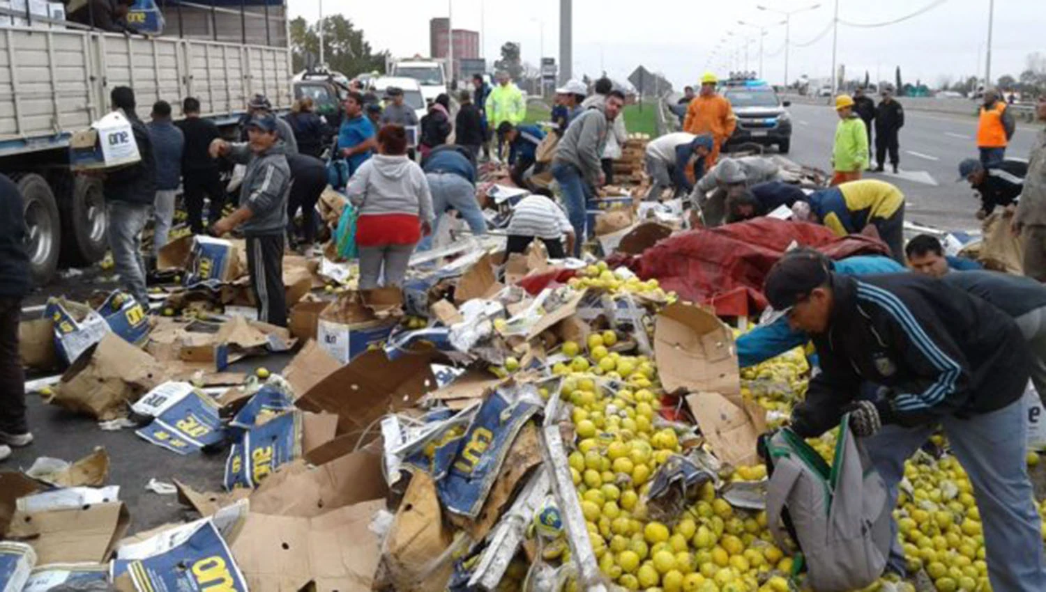 Pese al siniestro, el chofer no sufrió heridas y logró salir del camión por la ventanilla. Inmediatamente, decenas de vecinos de la zona se acercaron para apropiarse de la fruta en bolsos y cajas.
