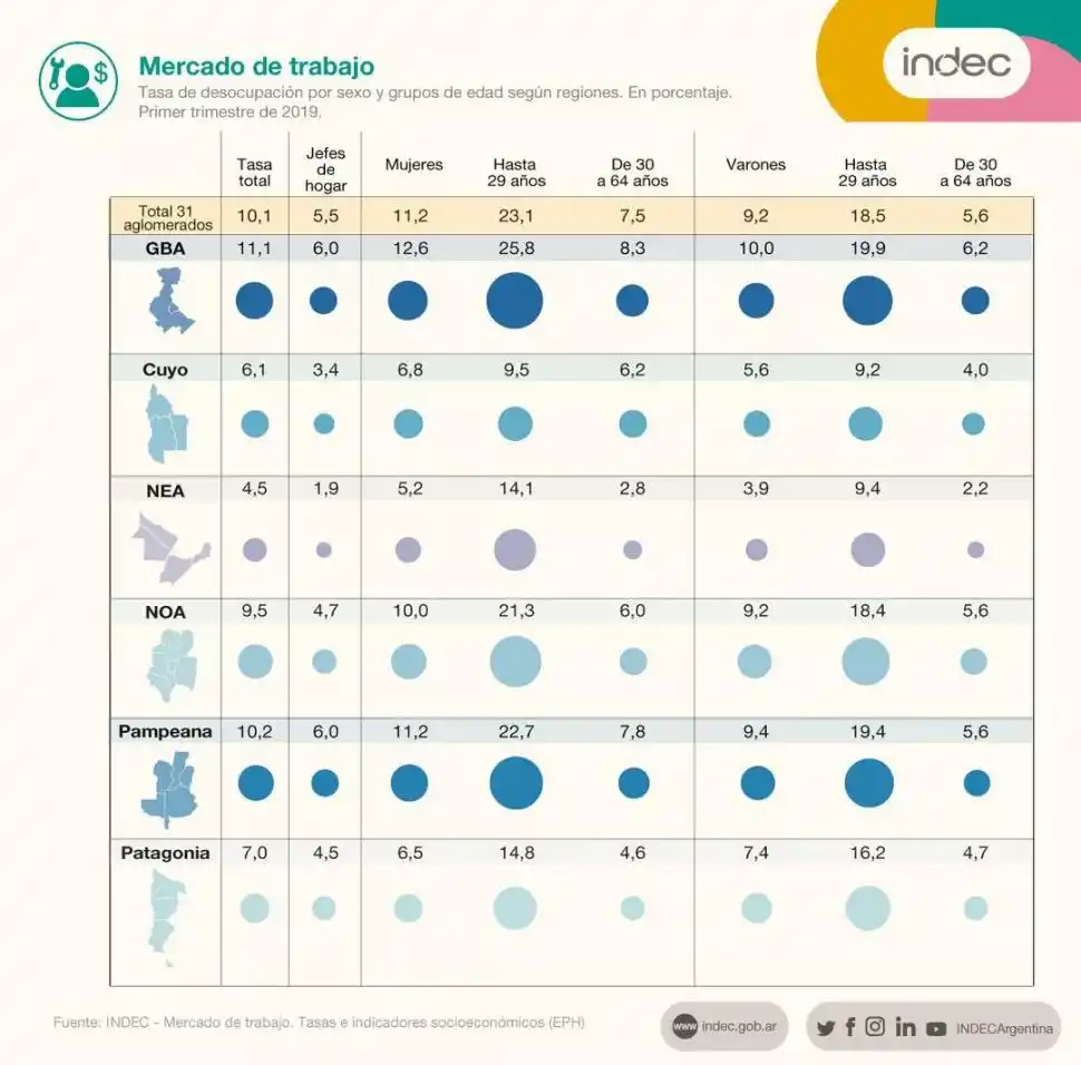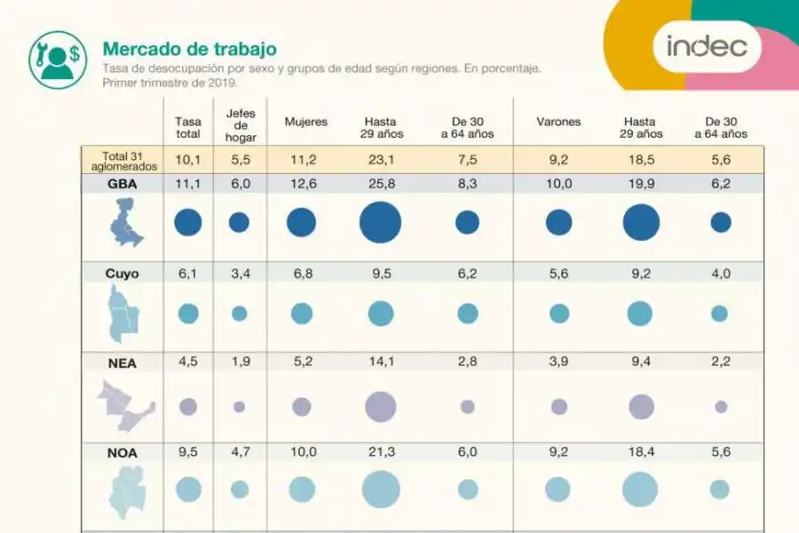 A nivel nacional, se informó que la desocupación fue del 10,1% interanual al término del primer trimestre del año en los 31 aglomerados urbanos relevados por el organismo oficial. “Nos preocupa: son 1,8 millón de argentinos que buscan empleo y no lo encuentran. Todos tienen que tener acceso a oportunidades”, sostuvo el ministro de Producción y Trabajo de la Nación, Dante Sica, a través de un comunicado. Así, la desocupación creció un punto porcentual respecto de igual período de 2018. El funcionario acotó que se está viendo “el impacto de la crisis del año pasado”.