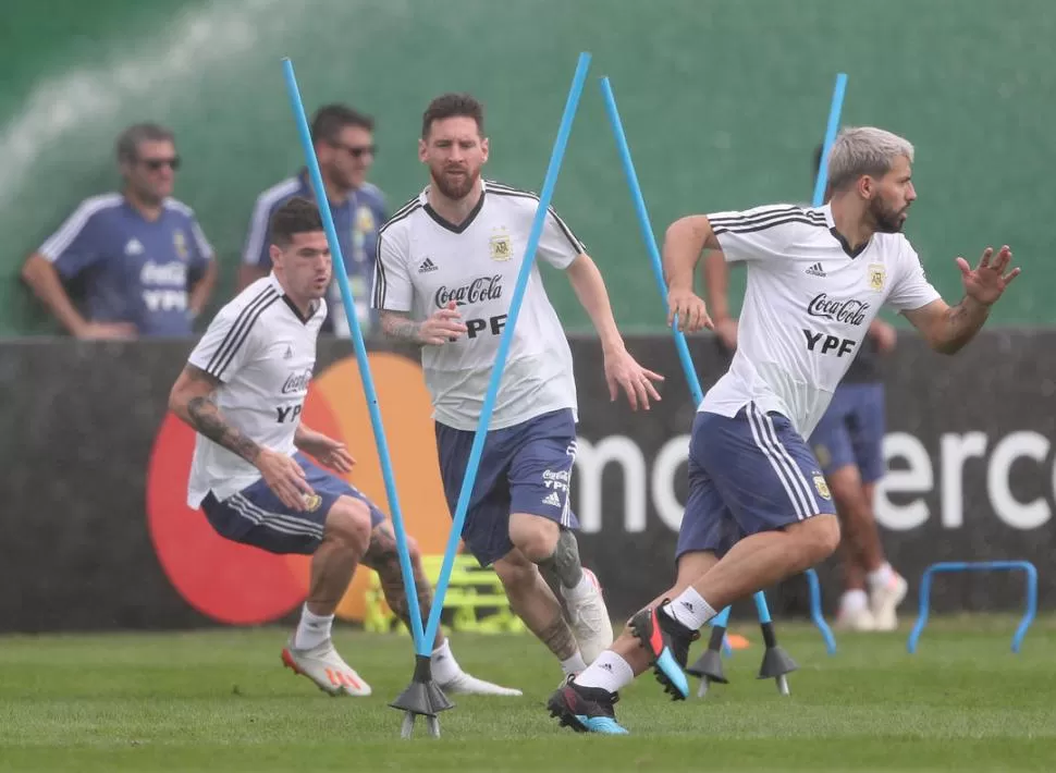 ENFOCADOS. De Paul, Messi y Agüero, trabajaron ayer con la mente puesta en seguir creciendo en la actual Copa América. reuters