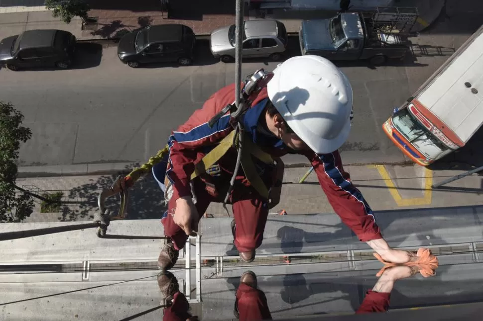 Tirarse no es ni más ni menos que arrojarse al vacío en la jerga de los limpiavidrios colgantes. Solo que con las medidas de seguridad adecuadas. Palacio recuerda esa experiencia como la más desafiante en su trabajo, que ejerce desde hace dos años en los edificios tucumanos. Nunca en su vida había hecho alpinismo. Ni siquiera había trepado un techo. Pero cuando en la empresa para la que trabaja (Beta) le preguntaron si se animaba a hacer la tarea, él se la jugó.
