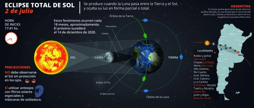 El proceso de oscurecimiento habrá empezado a las 16.34, y para las 18.37 todo habrá terminado. Sin dudas es un acontecimiento fascinante, pero -por favor-, que esa fascinación no te lleve a poner tu salud y las de los tuyos en riesgo: observar el eclipse sin la protección adecuada puede dañar seriamente los ojos. No sirven para protegerte los anteojos de sol ni las radiografías; de las soluciones caseras, sólo podría ayudarte un vidrio como los de las máscaras para soldar (pero parecen estar ya en falta en Tucumán).