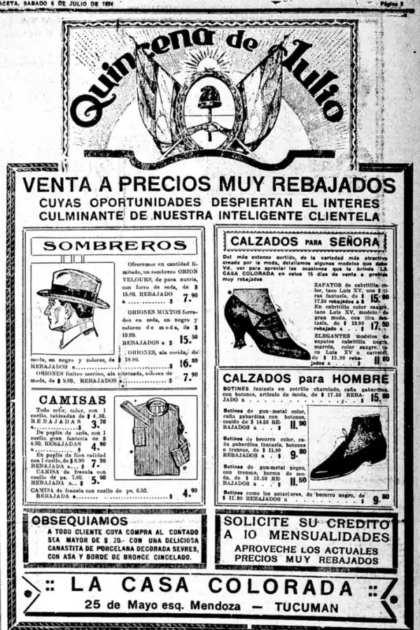 Junto con las fiestas de fin de año y la Navidad, las fiestas patrias, tanto de mayo como de julio, eran un momento del año en que el comercio realizaba campañas publicitarias ofreciendo sus productos a los tucumanos. En todas las publicidades se utilizaba la “fiesta julia” como elemento propagandístico. Se empleaban frases como “Semana Patria”, “Quincena de Julio. Ventas a precios muy rebajados”, “Semana de Julio, grandes rebajas”, “Nuestra semana de julio. Casa Voss”, “Esto lo debe tener bien en cuenta: con motivo de la semana de julio estamos vendiendo a precio verdaderamente bajos”, “Julio, el mes de las grandes rebajas”, entre otras más. Cabe destacar que las publicidades de fines de la década de 1910 y de 1920 ocupaban la tapa de nuestro diario en su totalidad. “Kalisay” era un aperitivo quinado que deleitaba “los paladares de grandes y chicos, recomendado por los médicos por brindar vigor al organismo”.