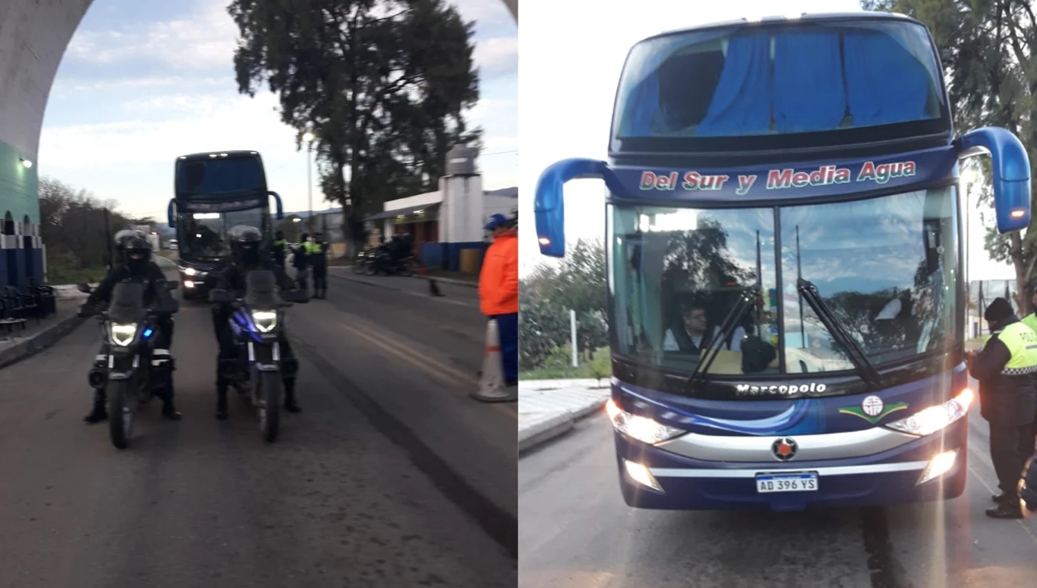 Efectivos del Grupo Operativo Motorizado (GOM) y de la comisaría La Cocha escoltan el colectivo de la empresa mendocina.
