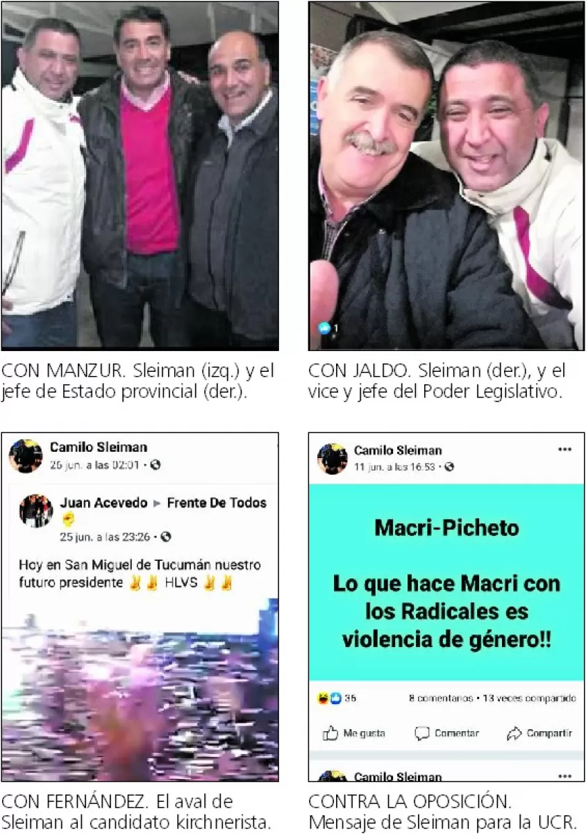 Las imágenes recolectadas por Canelada muestran al postulante junto a Juan Manzur, el gobernador que lo escogió para cubrir el cargo vacante en el Ministerio Público de la Defensa. Sleiman cerraba la terna que encabezaba Claudio Hernán Aybar seguido de María Alejandra Rivas. En otra de las fotos el aspirante a un despacho asimilado al juez de primera instancia desde el punto de vista de los privilegios y de la remuneración posa junto a Osvaldo Jaldo, vicegobernador y presidente del Poder Legislativo.