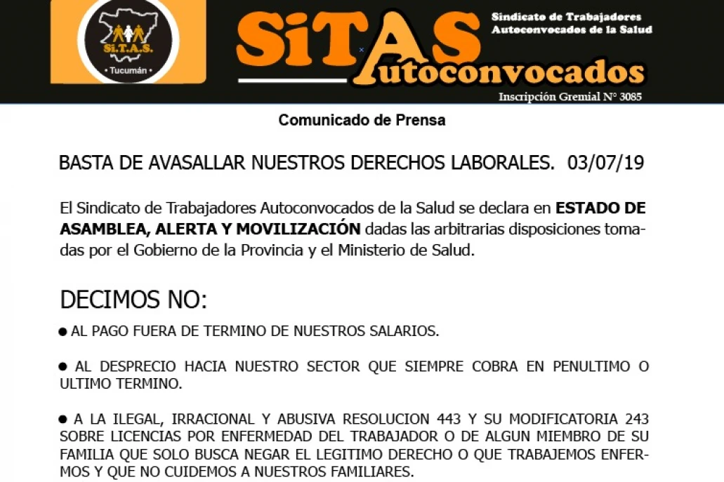 Ayer, desde la seccional local de la Asociación de Trabajadores de la Sanidad Argentina (ATSA) ya le habían pedido al Gobierno que adelantara la fecha de pago de los sueldos de junio ya que "la situación económica" le impide a sus afiliados cumplir con sus "necesidades básicas".