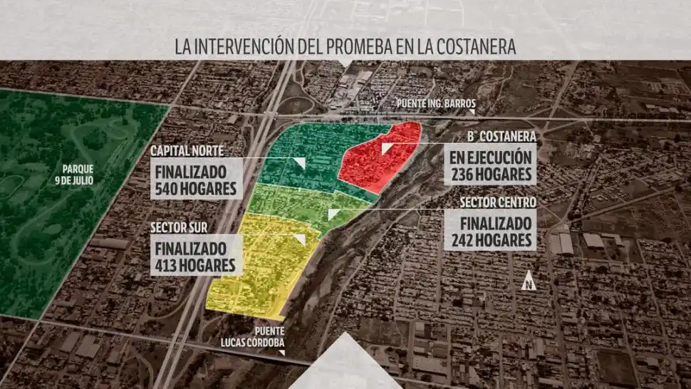 La intervención del Promeba “Riberas del Salí” (las denominaciones de las zonas son del programa) abarca un territorio que incluye Capital, Alderetes y Banda del Río Salí. En capital finalizaron tres de cuatro etapas de la obra.
