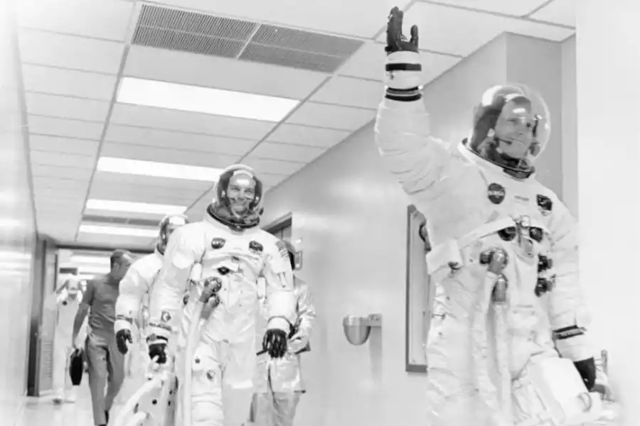 2.- Armstrong, Aldrin y Collins saludan antes de abordar la nave en Cabo Cañaveral (Florida). Era el 16 de julio de 1969.