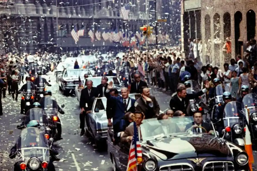 8.- Armstrong, Collins y Aldrin saludan a la multitud desde el auto descapotable que circula por Manhattan, en el corazón de Nueva York. Esa zona de Broadway es conocida como el “Cañón de los Héroes”. Fue el desfile triunfal.