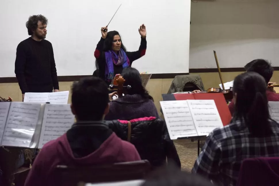 ENSAMBLE. Bruno Moreno, de Música Para Volar, y Marcela Roselló, con la batuta al frente de la orquesta. LA GACETA / FOTO DE DIEGO ARÁOZ.-