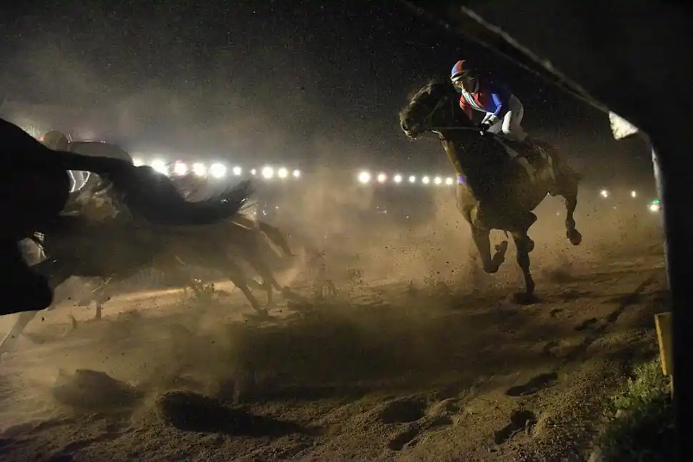 “Al no tener la necesidad periodística de que el ganador esté cruzando la meta, utilicé una lente gran angular. Eso dio una sensación de cercanía y nos regala una fotografía distinta contrapicado, lo que genera mayor expectativa”, contó Franco Vera sobre la imagen que logró en clásico “Caja Popular” de turf.