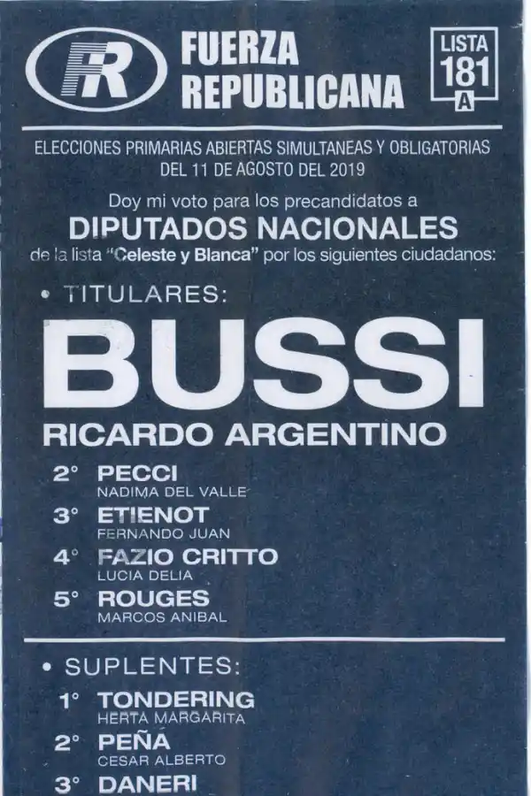 “No tengo una rutina ni una cábala para el día de las elecciones”, confiesa el concejal saliente y legislador electo, Ricardo Bussi. El líder de Fuerza Republicana, partido fundado por su padre, Antonio Bussi, llega a las PASO secundado por Nadima Pecci. Votará en la Escuela Ciudadela, que está ubicada en avenida Colón, esquina La Madrid, en San Miguel de Tucumán. En estas nacionales, Bussi selló una alianza con el precandidato a presidente del Frente NOS, Juan José Gómez Centurión. De los “cabeza” de lista en Tucumán, el abogado es el único que obtuvo un cargo electivo en las pasadas elecciones provinciales.
