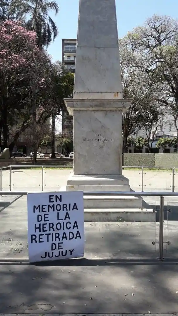 Una vecina tomó la foto superior en la plaza Belgrano, y dio cuenta de que alguien puso un llamativo cartel en el lugar, frente a la pirámide instalada en el paseo. El cartel pretende recordar la heroica gesta de “El éxodo jujeño”, fecha de la historia argentina que fue recordada días pasados. La lectora se queja porque cualquier persona pone un cartel en el monumento.
