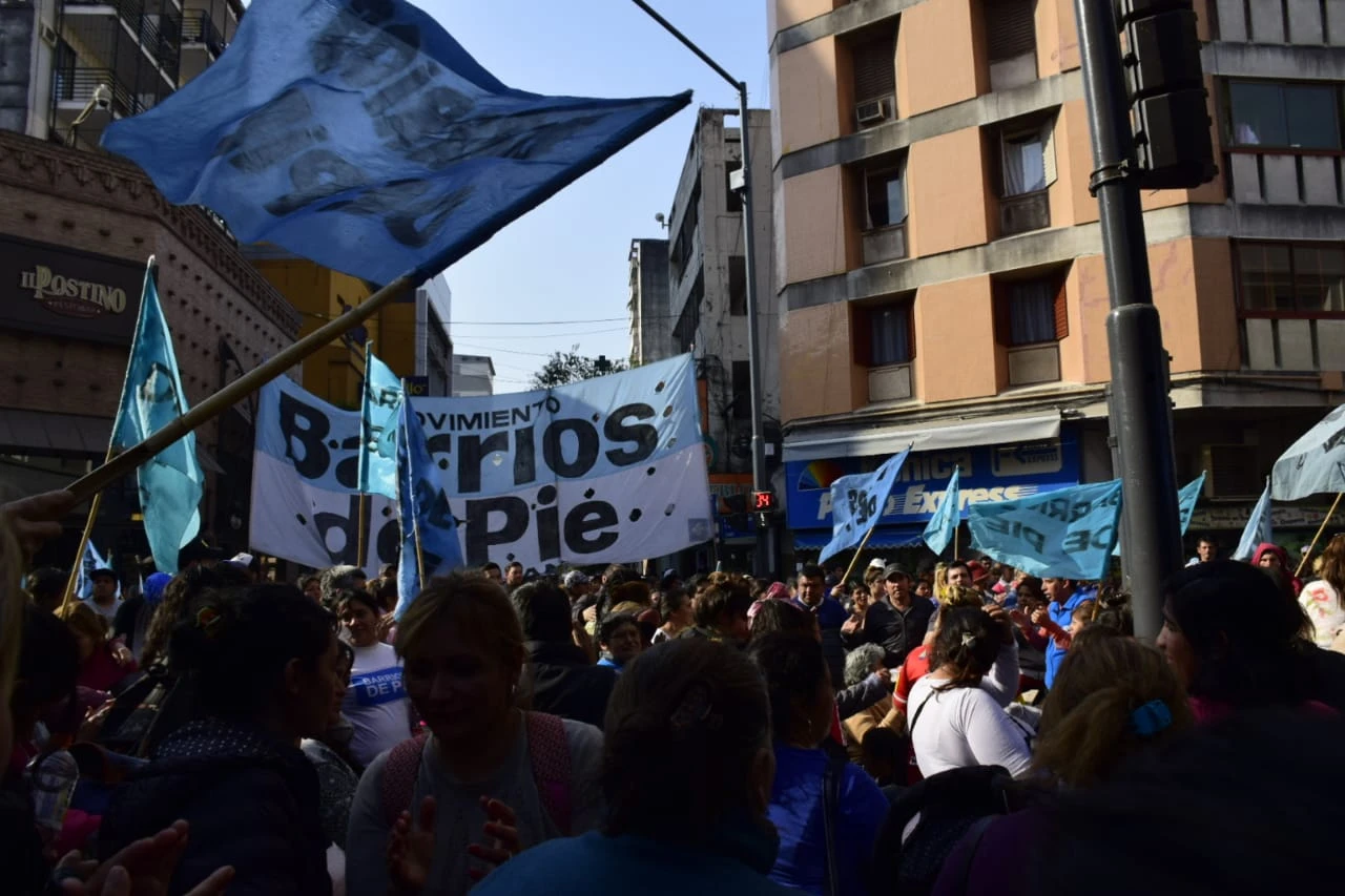 Militantes de la organización Barrios de Pie protestan nuevamente frente a la sede de la Anses, en Córdoba y 25 de Mayo. Advierten que permanecerán allí hasta que les den una solución al reclamo de 450 beneficiarios.