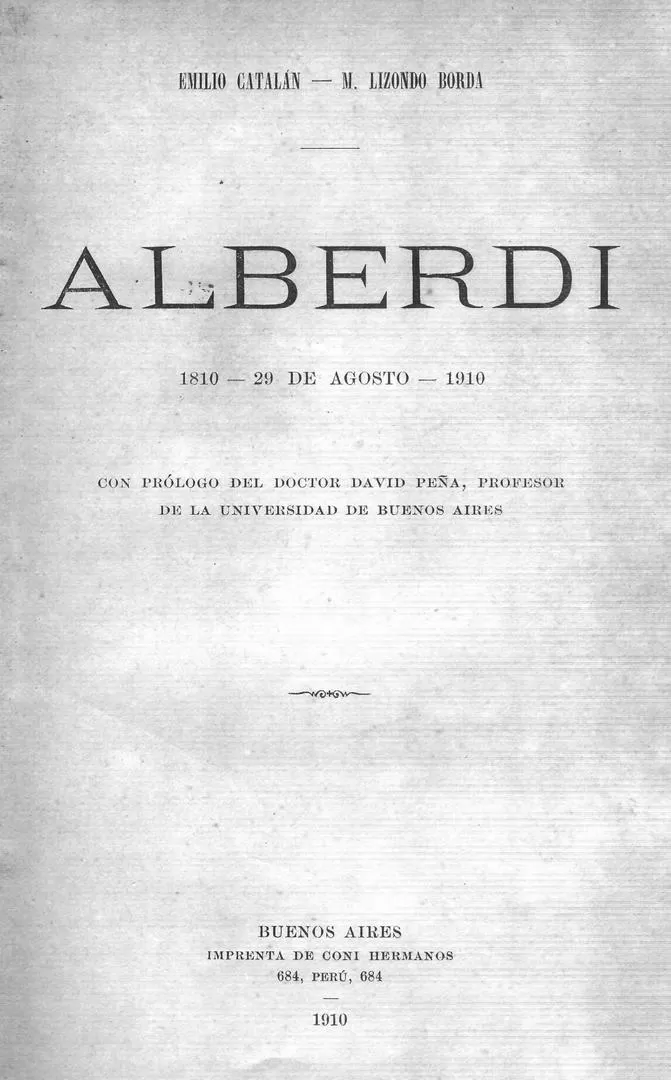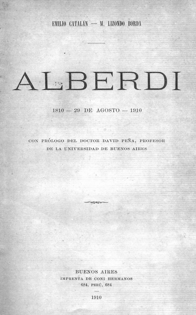 El “Alberdi” de Lizondo Borda y Catalán, estaba prestigiado por un texto de apertura que firmaba el historiador David Peña. La “advertencia” de los autores agradecía la colaboración de Peña, que hacían constar en la portada. Expresaban que, a pesar de su brillante actuación, Alberdi “es tan poco conocido por la mayoría, que ha primado, antes bien, un ocultismo sin razón, merced al criterio de ciertos autores llenos aún de las nerviosidades cruentas de la lucha del instante, heredadas por la ley del atavismo”.